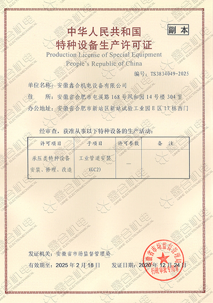 目前我公司具有建筑機電安裝工程專業(yè)承包一級資質(zhì)、總承包二級、GC2壓力管道設計、施工資質(zhì)。現(xiàn)有高級工程師5名、高級技師55名、工程師22名、助工25名、技術員22名、各類專業(yè)技師50多名,強大的技術力量及精良的施工隊伍,為客戶提供全方位服務。 公司本著“一切為了用戶”的經(jīng)營理念,“以品質(zhì)求生存、以誠信贏市場、以管理促發(fā)展”為要求,努力為廣大客戶提供專業(yè),優(yōu)質(zhì)、高效的服務。